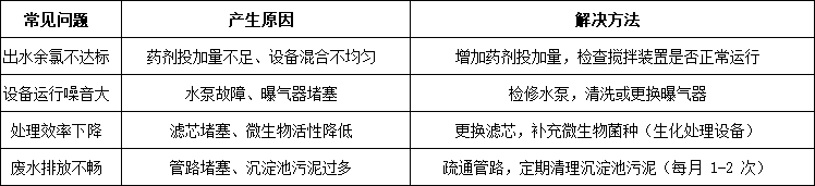 ①.定期檢查:每日查看設(shè)備運(yùn)行狀態(tài),包括水泵、曝氣器、消毒模塊是否正常工作,儀表盤數(shù)據(jù)是否在標(biāo)準(zhǔn)范圍內(nèi);
